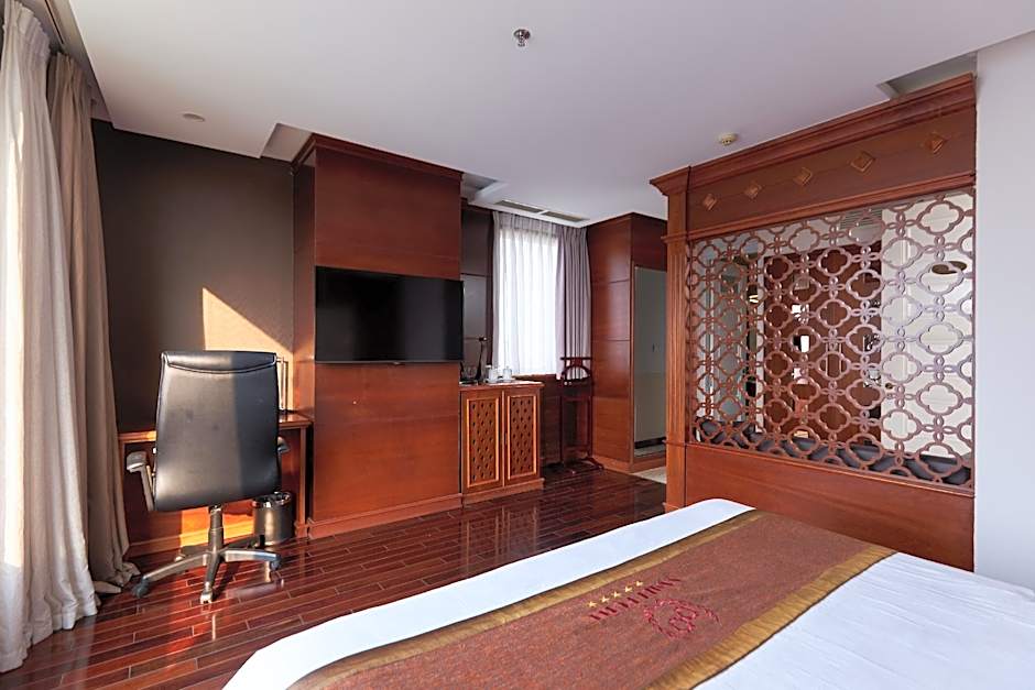 SAMDI VIP KING ROOM is 592 square feet and includes a king-size bed 150-183 width plus desk, satellite tv , cable tv, hairdryer, safe, and slippers.